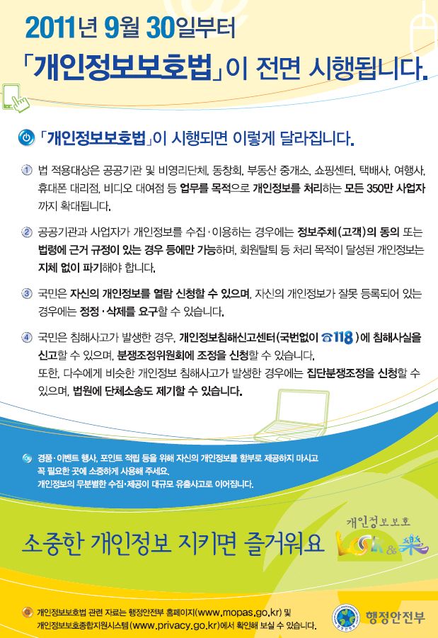 2011년 9월 30일부터「개인정보보호법」이 전면 시행됩니다. - 행정안전부 -