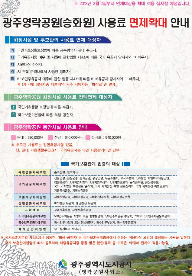 광주영락공원(승화원) 사용료 면제확대 안내 - 2013년 2월 2일부터 적용 예정