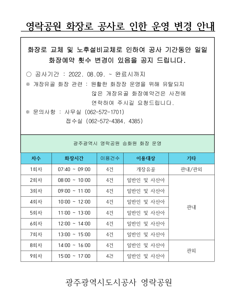 영락공원 화장시설 운영변경안내